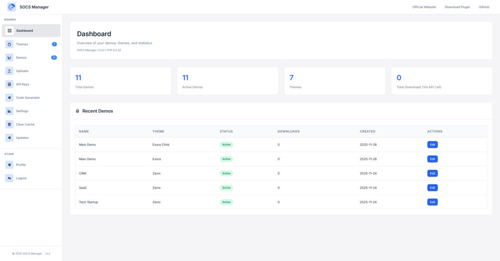 SmartOCS Cloud is a powerful self-hosted PHP deployment & remote demo file delivery system built for WordPress theme and plugin developers. It lets you centrally manage demo files, push instant updates, and deploy full demo content to unlimited client websites with one click—no repeated uploads, no manual setup.